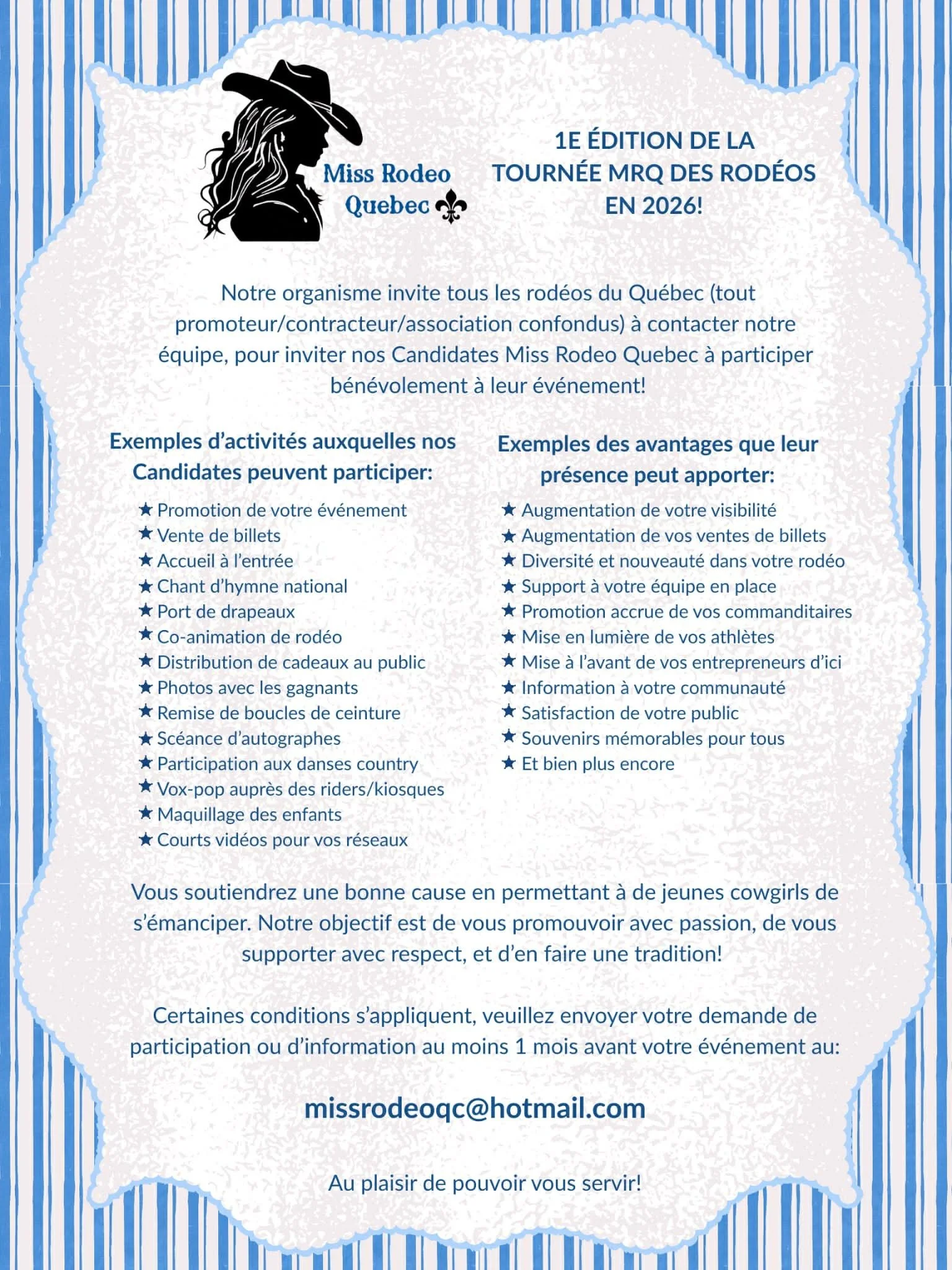 Si vous êtes une jeune cowgirl entre 18 et 25 ans, scolarisée (DES), bilingue, non mariée, sans enfants, à l’aise de s’exprimer publiquement, d’apparence soignée, sachant bien monter à cheval et surtout, passionnée de rodéo, nous serions heureux de recevoir votre candidature au titre de Miss Rodeo Quebec à travers le formulaire ci-dessous!
